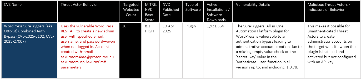 CVE-2025-3102 is a critical authentication bypass vulnerability in the WordPress SureTriggers (aka OttoKit) plugin, affecting versions up to 1.0.78. The flaw allows unauthenticated Threat Actors to create new administrator accounts by exploiting missing checks on the ‘secret_key’ value in the authentication function, even when not logged in. This enables Threat Actors to gain full control over the affected WordPress sites, including the ability to upload malicious plugins, modify content, and hijack traffic. The vulnerability has been actively exploited, with reports of Threat Actors creating admin users across multiple sites, leading to severe security breaches globally. 16 sites can be confirmed compromised if the account still exists.