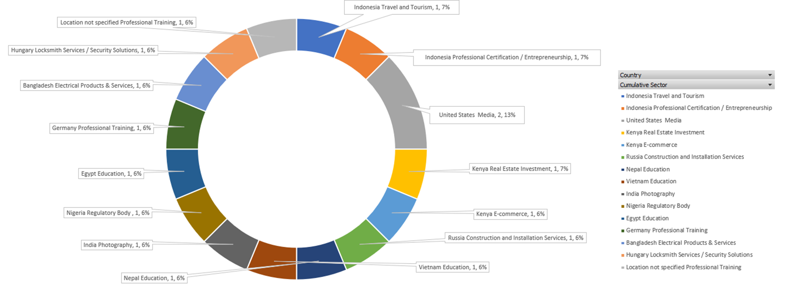 European region countries like Russia, Germany, and Hungary are targeted for sectors like Professional Training, Construction and Installation Services, Locksmith Services – Security Solutions, which can lead to course material leaks and unauthorized access.