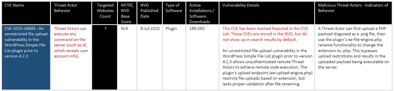 CVE-2025-34085: An unrestricted file upload vulnerability in the WordPress Simple File List plugin before version 4.2.3 having a rejected CVE – CVSS Unknown – Threat Actor targeted 7 websites of various sectors across multiple regions, including a global product development and sourcing firm in the United States, higher education institutions in Colombia, Paraguay, and India, the industrial equipment sector in Thailand, and the jewellery manufacturing industry in Italy to Upload a malicious executable file via /wp-content/plugins/simple-file-list/ee-upload-engine.php which will enable remote code execution.