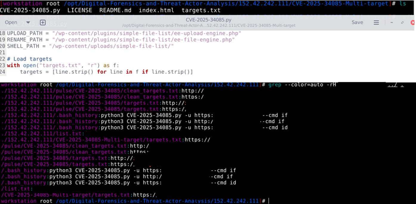 In this attack pattern, the threat actor used 2 types of .py scripts [ simple.py and Multi Target – CVE-2025-34085.py], which loaded domains from targets.txt