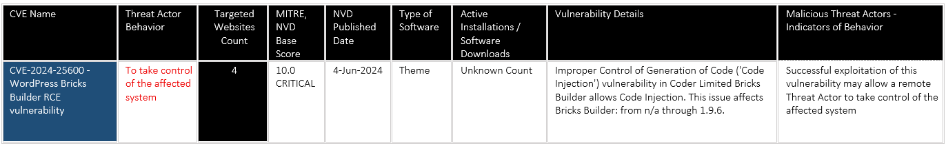 CVE-2024-25600 – WordPress Bricks Builder RCE vulnerability with CVSS 10.0 Critical score – On 4 WordPress websites, the threat actor was able to execute custom scripts admin.py, exploit.py, and post.py, which can lead to malicious user creation to custom WebShell upload. Impacted websites belong to Digital Marketing, Higher Education, Media / Student Journalism sectors, which can be used to infect/exploit multiple users.