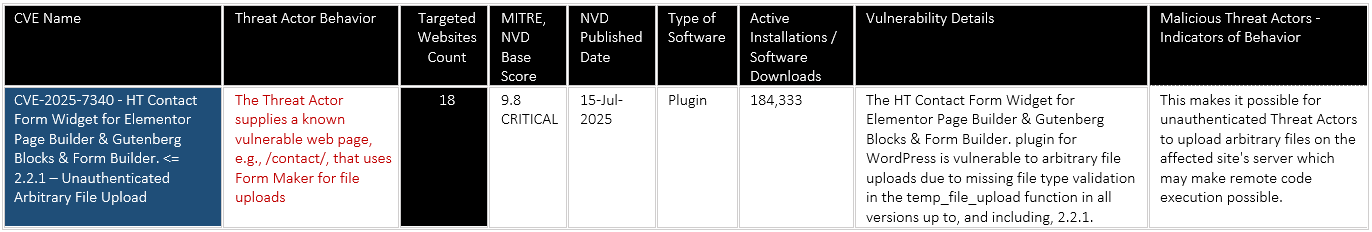 CVE-2025-7340 – HT Contact Form Widget for Elementor Page Builder & Gutenberg Blocks & Form Builder. <= 2.2.1 – Unauthenticated Arbitrary File Upload with CVSS 9.8 Critical score – Threat actor successfully uploaded shell.php to the “Contact-us / Contact” pages of 16 websites. Primary focus on the Education sectors in Europe, Africa, Asia, and the United States regions, while Conferences like the Outreach & Recruitment Annual conference in Colombia.