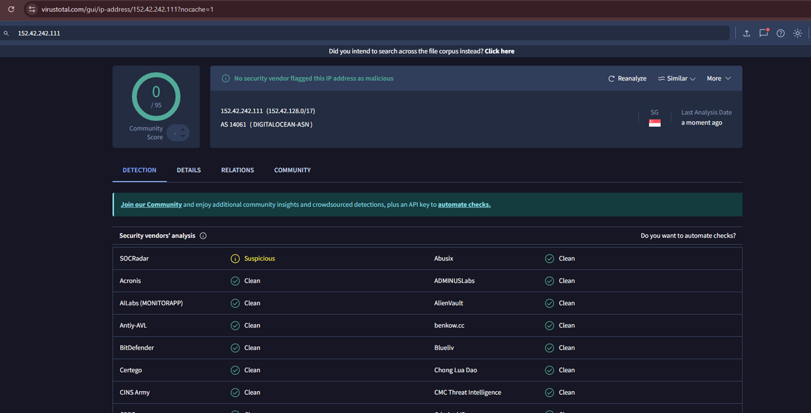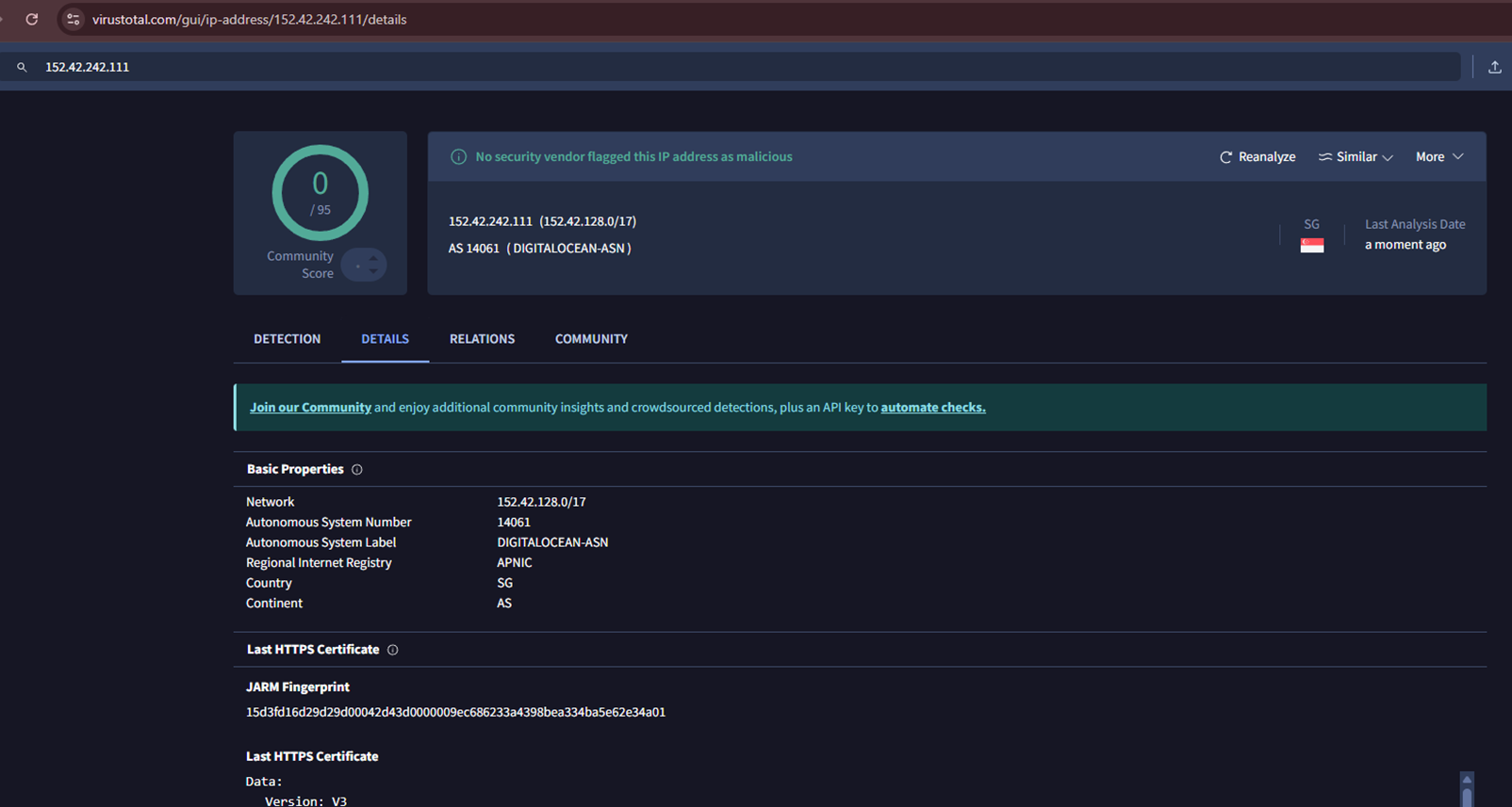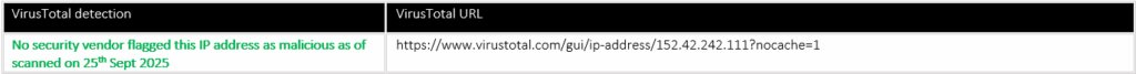 Infrastructure Analysis: Analyse the IP addresses, domains, and servers used by the Threat Actors to identify their geographic location and operational patterns. As per Virustotal analysis, this IP is not flagged as malicious at the Global Intelligence level.